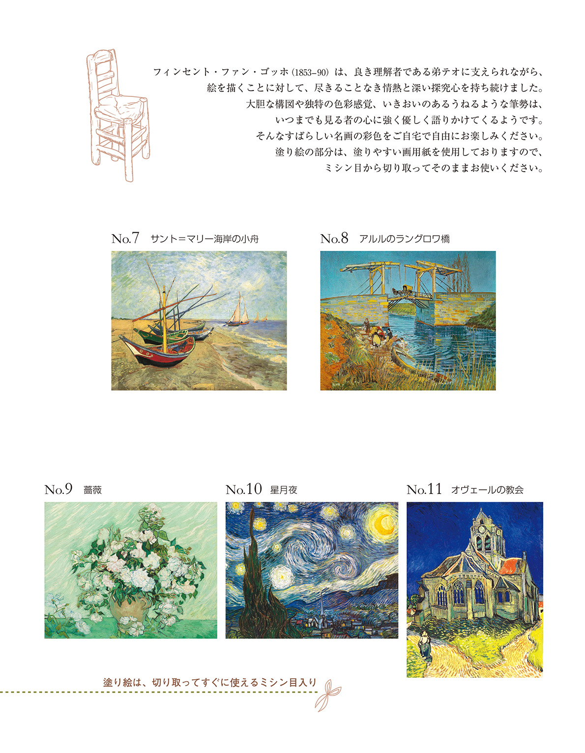 「ひまわり」「星月夜」「糸杉」「夜のカフェテラス」「アルルの寝室」などゴッホの代表的な作品が塗り絵になりました。自由に彩色を楽しんで、情熱的な絵に仕上げてください。新装改訂版。