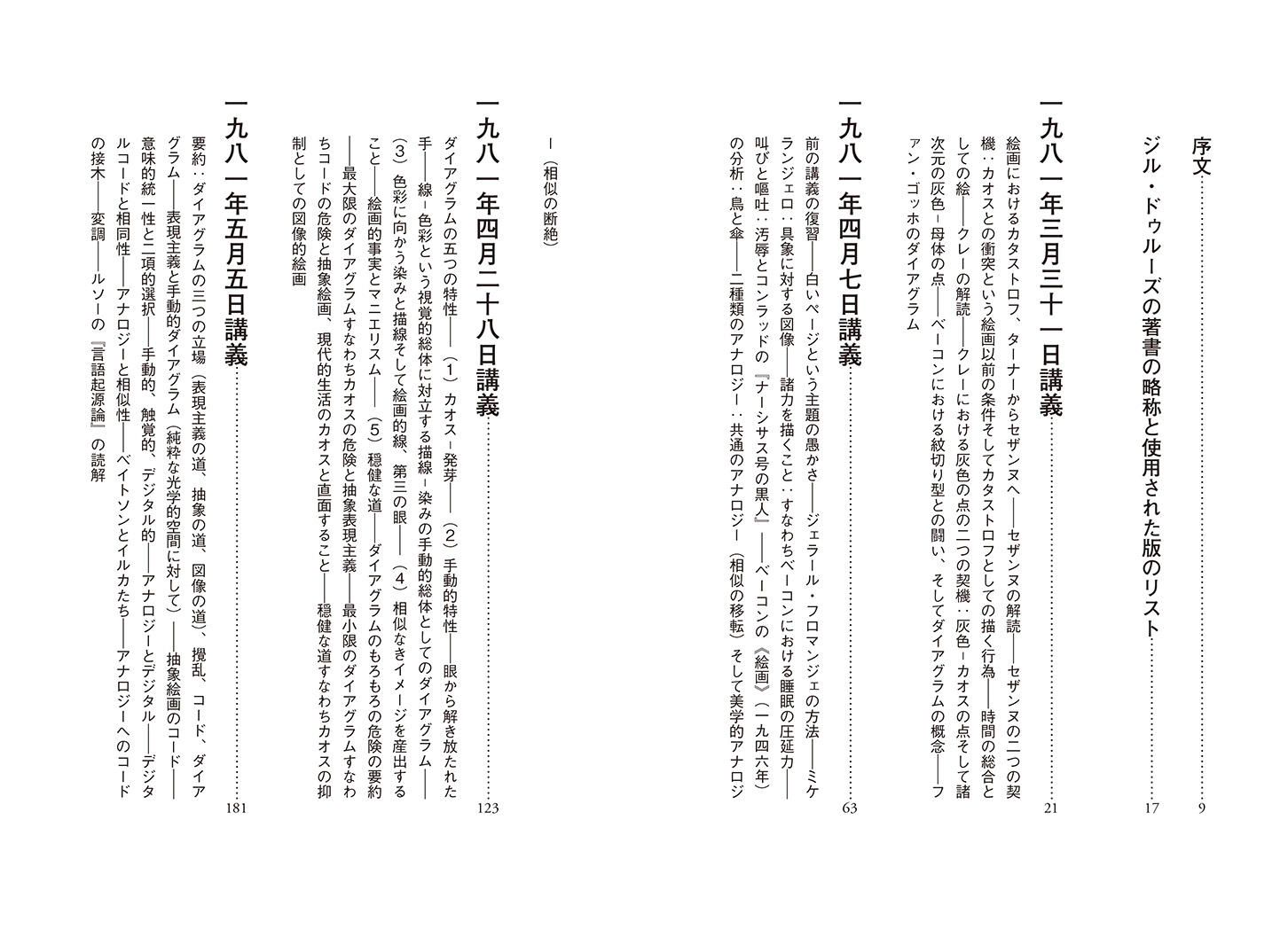 要約:ダイアグラムの三つの立場(表現主義の道、抽象の道、図像の道)、攪乱、コード、ダイアグラム/表現主義と手動的ダイアグラム(純粋な光学的空間に対して)/抽象絵画のコード/意味的統一性と二項的選択/手動的、触覚的、デジタル的/アナロジーとデジタル/デジタルコードと相同性/アナロジーと相似性/ベイトソンとイルカたち/アナロジーへのコードの接木/変調/ルソーの『言語起源論』の読解