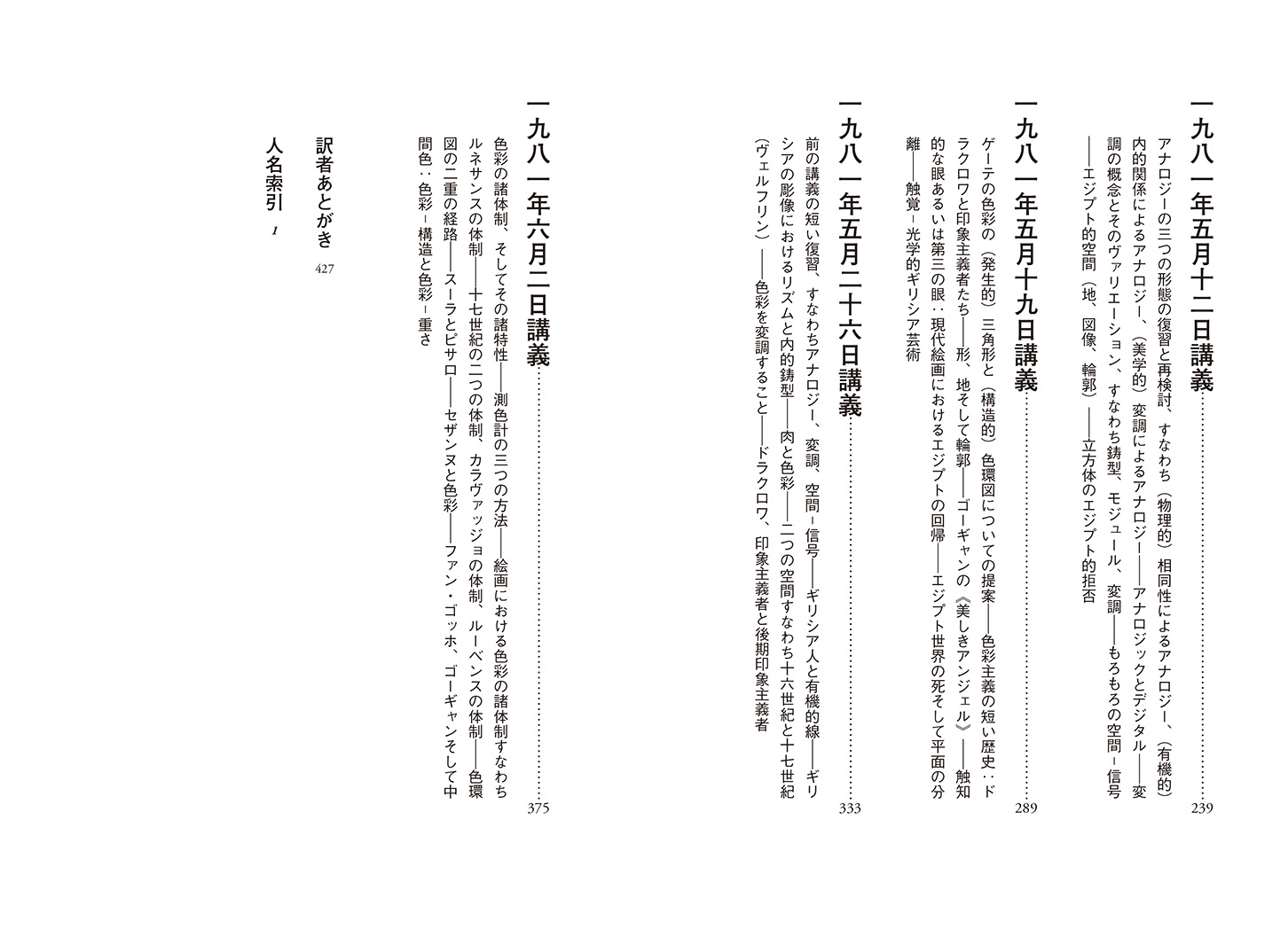 ゲーテの色彩の(発生的)三角形と(構造的)色環図についての提案/色彩主義の短い歴史:ドラクロワと印象主義者たち/形、地そして輪郭/ゴーギャンの《美しきアンジェル》/触知的な眼あるいは第三の眼:現代絵画におけるエジプトの回帰/エジプト世界の死そして平面の分離/触覚-光学的ギリシア芸術