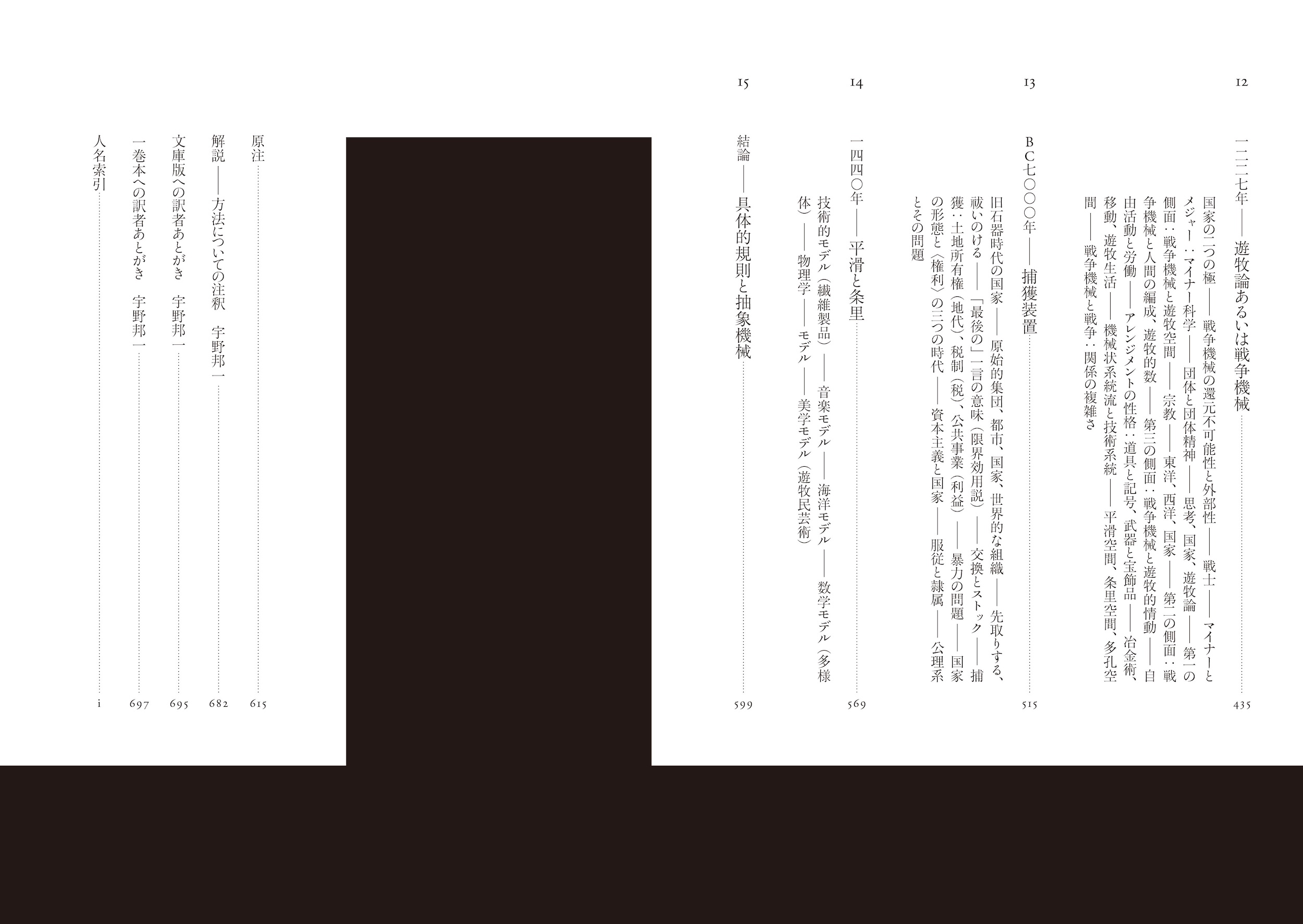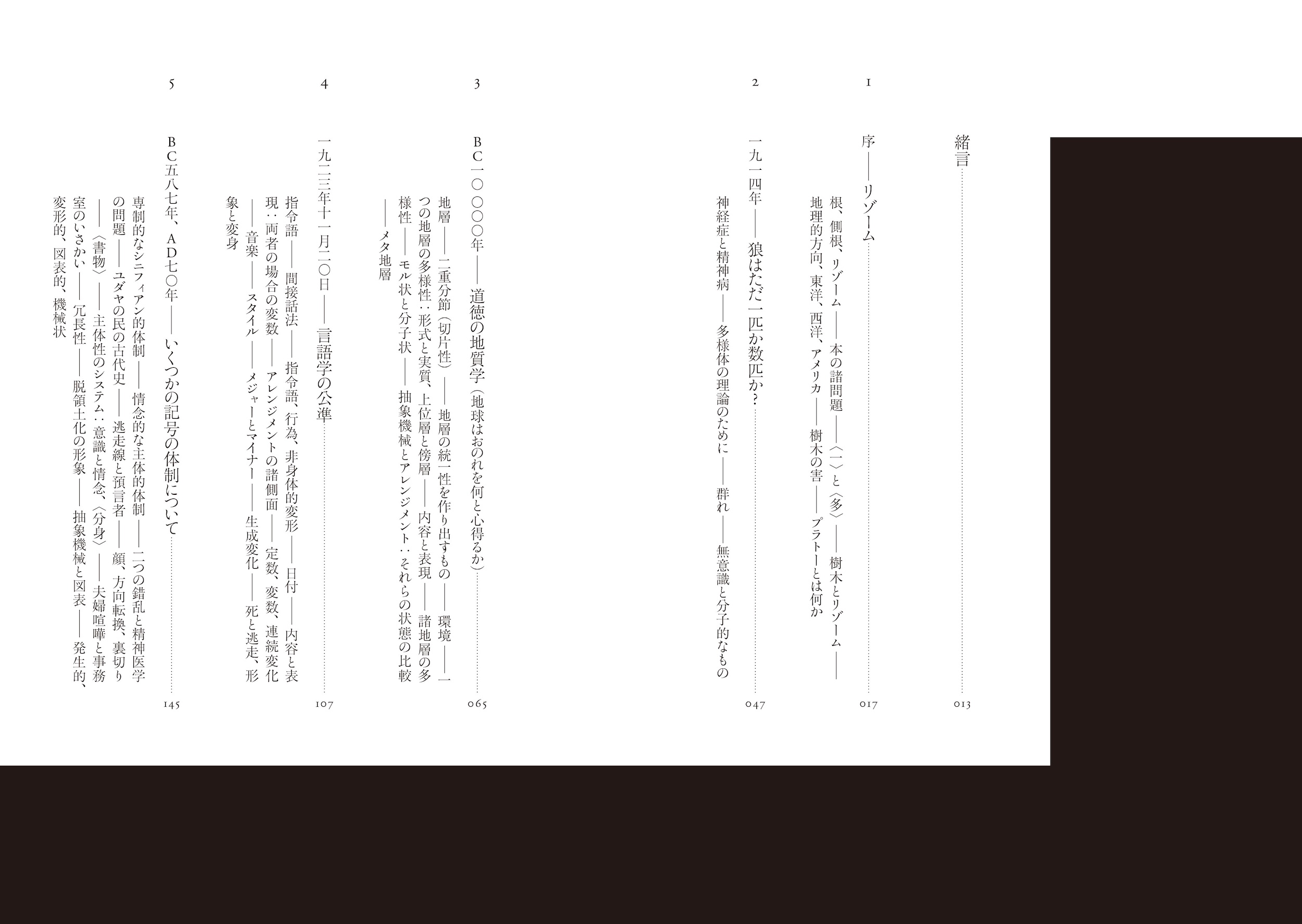 リゾーム、抽象機械、アレンジメントなど新たな概念によって宇宙と大地をつらぬきつつ生を解き放つ。顔貌性、そして逃走線の考察から生成変化をめぐりつつ、宇宙の時を刻むリトルネロへ向かい、絶対的な脱領土化の果ての来たるべき生と民衆を問う。そして、戦争機械、捕獲装置を論じ、かつてない国家、戦争、技術、資本への問いから、平滑空間/条里空間の考察を経て非有機的生に向かう壮大な歴史哲学の試み。