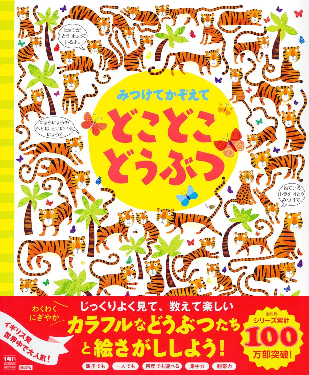 カラフルな動物たちの絵さがし本。トラ、ゾウ、アライグマ、ペンギン、キリンなどが出すクイズに答えたり自分たちでクイズを考えたり。観察力や数・言葉の力が育ちます。新装版