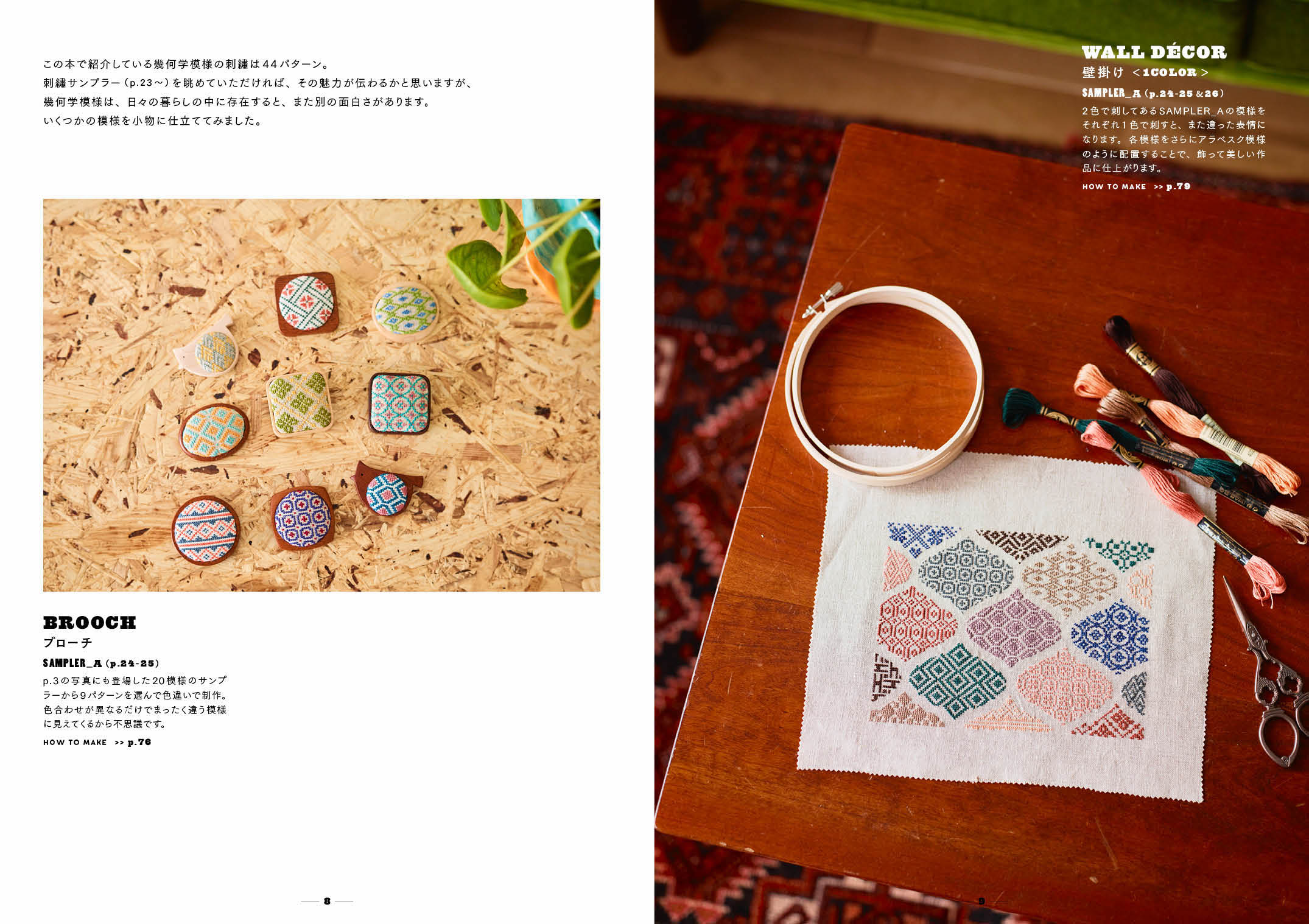 「西アジア、東欧、中東などで見つけるモザイクタイル、織物やニット、工芸品などは、素敵なデザインがたくさん。三角形、四角形、六角形や円に直線など、実はシンプルな形で模様が構成されているのに、とても魅力的です。また、幾何学模様の楽しさは、色選び・色合わせにもあり、同じ模様でも違う色で刺せば、まるで違うものになります。