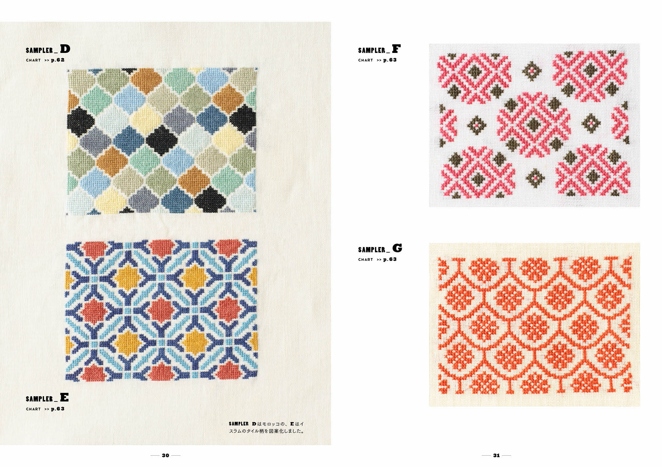 モロッコのタイル、インドネシアのテキスタイル「イカット」、イスラムの織物「ダマスク」などを参考にしたクロスステッチ図案や、バルジェロ刺繍で描く幾何学模様など。同名書籍の新装版。