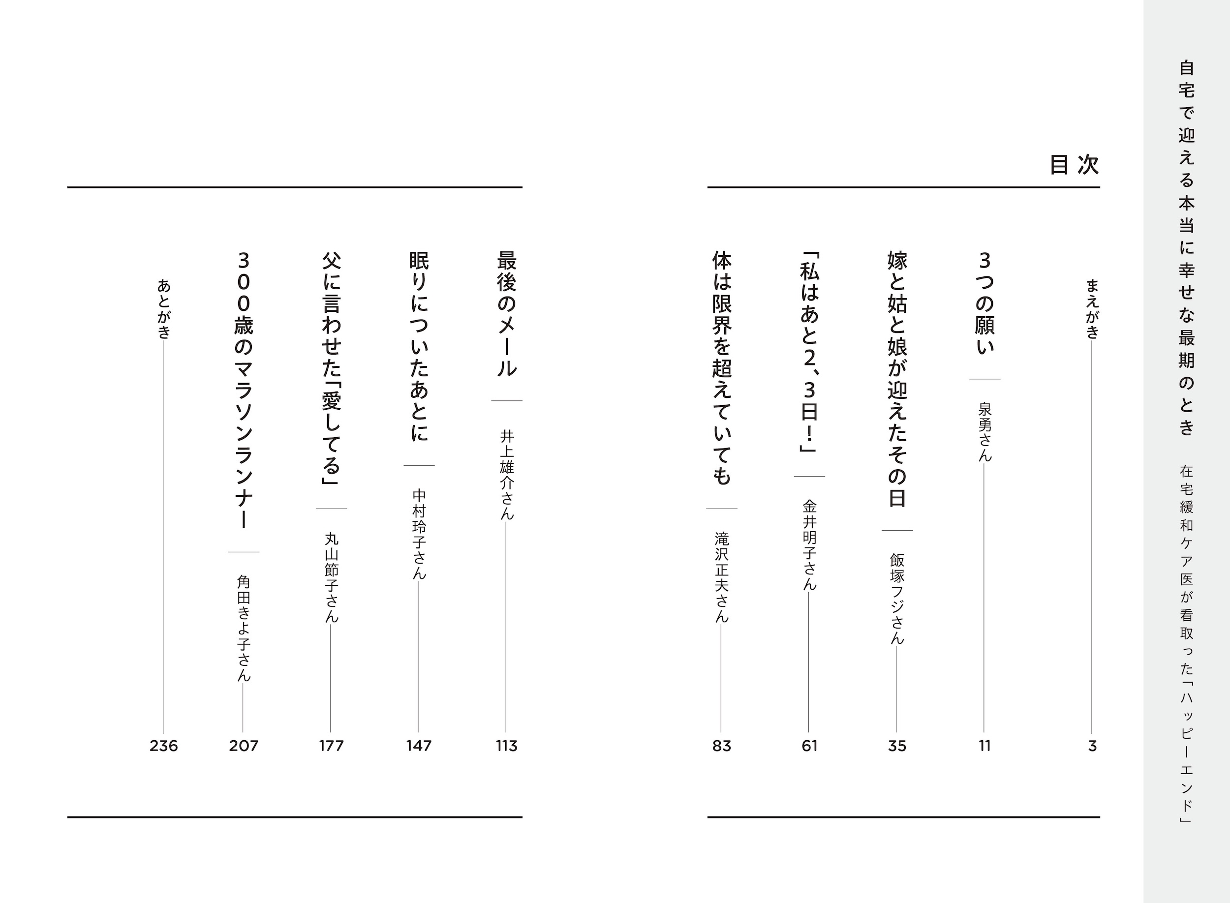 賃貸アパートで最後まで一人暮らしを続けて逝った60代の男性、嫁と娘に見守られながら最後までベッド上の排泄を拒否した90代女性、自宅の庭で念願のバーベキュー大会を実行した8日後、自宅で母親に看取られて亡くなった元ヤンの21歳の青年、仕事と趣味のサーフィンを続け、予定通り緩和ケア病棟に入院し、翌朝亡くなった独身・一人暮らしの30代女性etc.……。