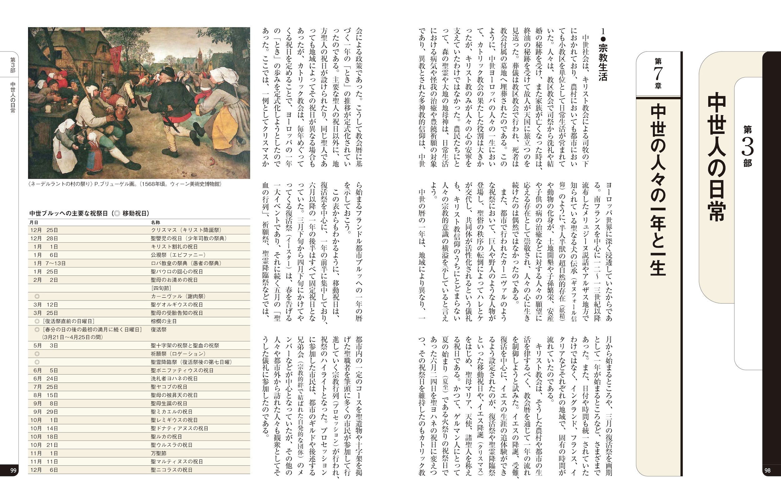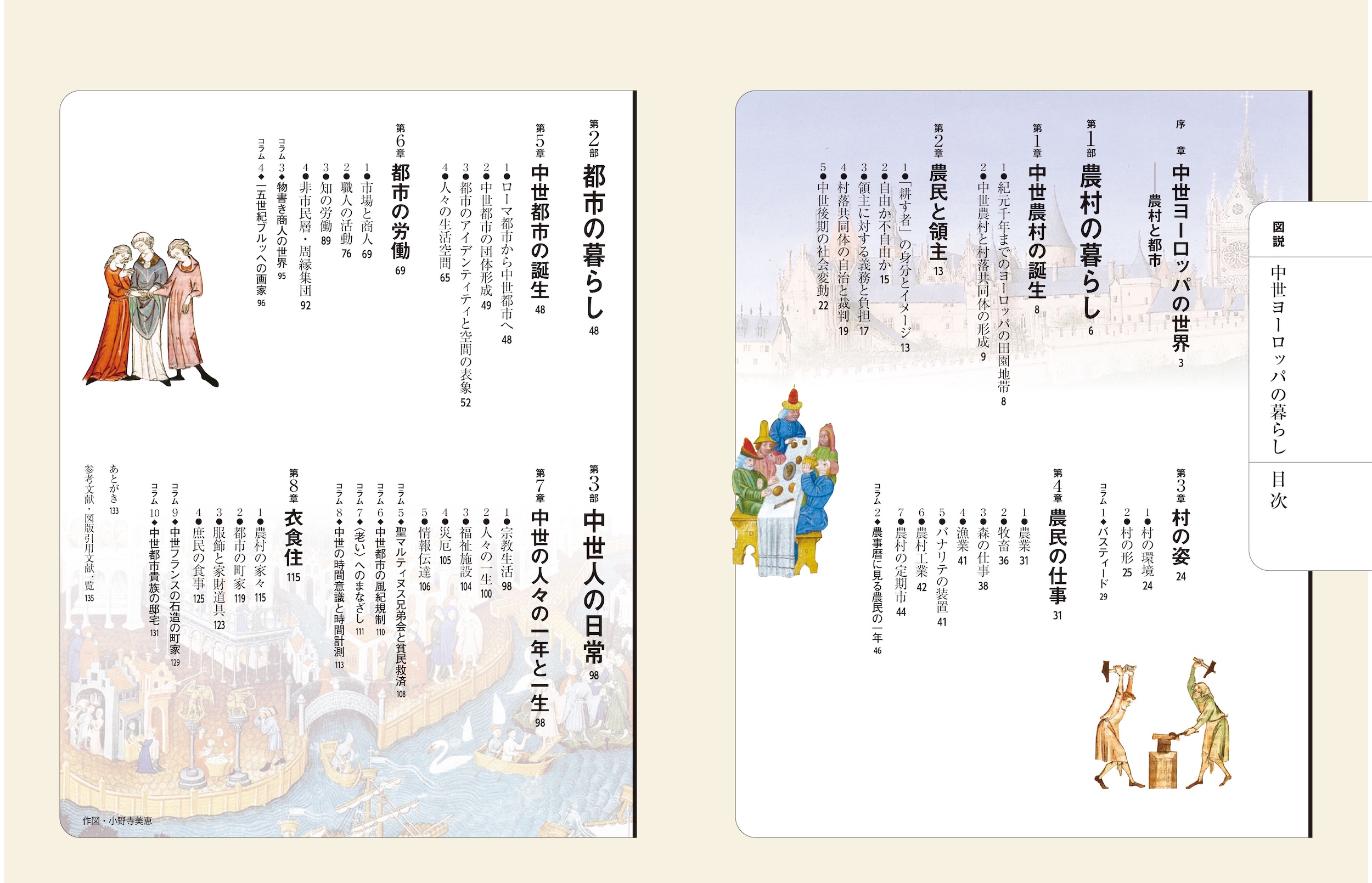 衣食住、生活環境、職業、労働、信仰、暦、家族……中世ヨーロッパの農村と都市に生きた人々の暮らしと一生を、豊富な図版で分かりやすく紹介する決定版ビジュアルガイド。中世人の日常の部を増補。
