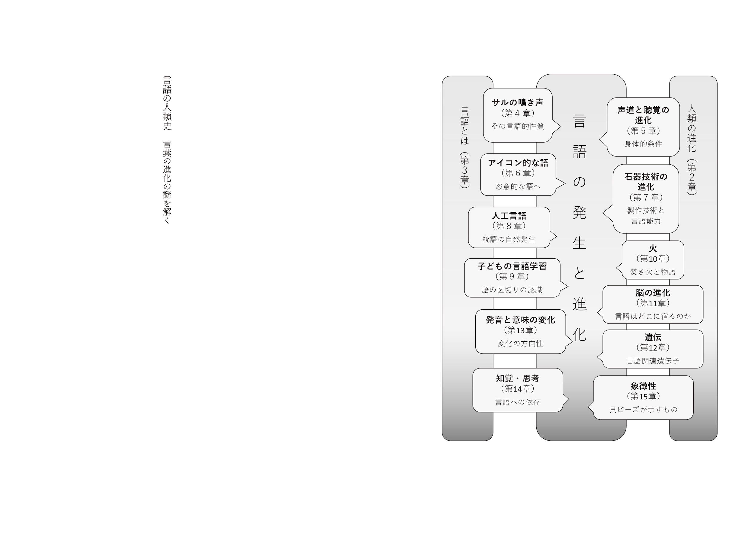 サルの鳴き声、声道のしくみ、石器の製作、子どもの言語学習、火の使用、脳の進化、遺伝、意味や発音の変化、抽象思考、象徴性……