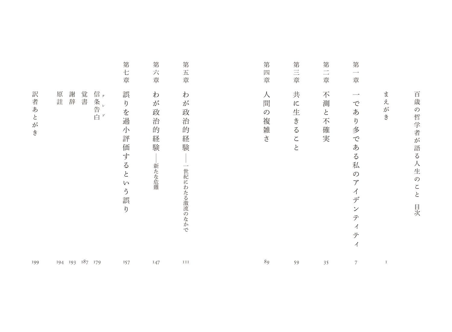 この本で、私は教訓を与えるつもりはありません。一世紀にわたる経験、一世紀にわたる人生から、自分なりの教訓を引き出そうと試みました。みなさんが自分の人生について考え、自分の道を見出すのに役立てば幸いです。 (「まえがき」より) -