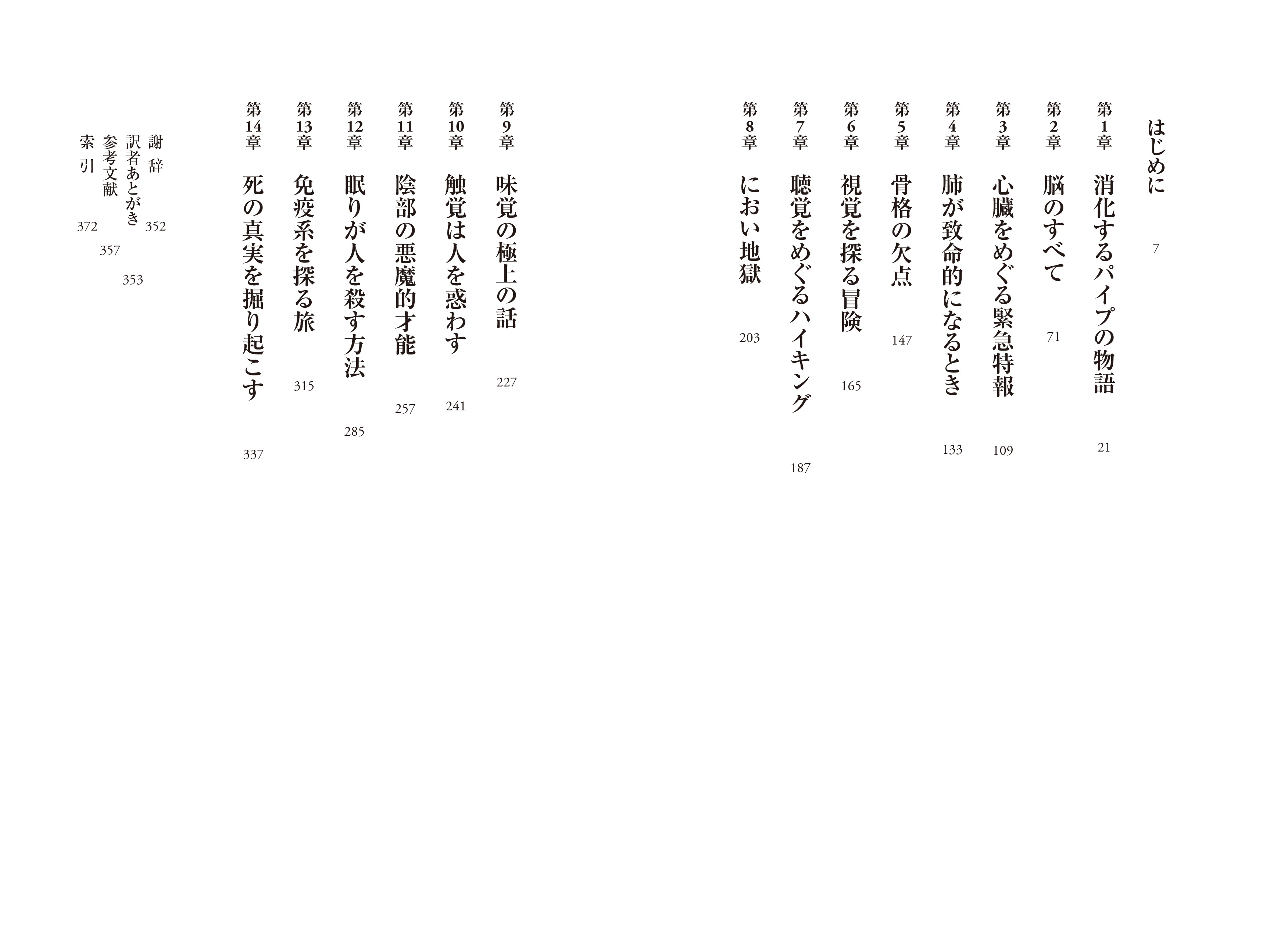 外科医の経験をもとに、ユーモラスな文体で、人体の知られざる機能や生物学的な意味をわかりやすく、しかも驚きに満ちた内容で明かす。実用的なアドバイスも含めて、あなたの命を救う一冊。