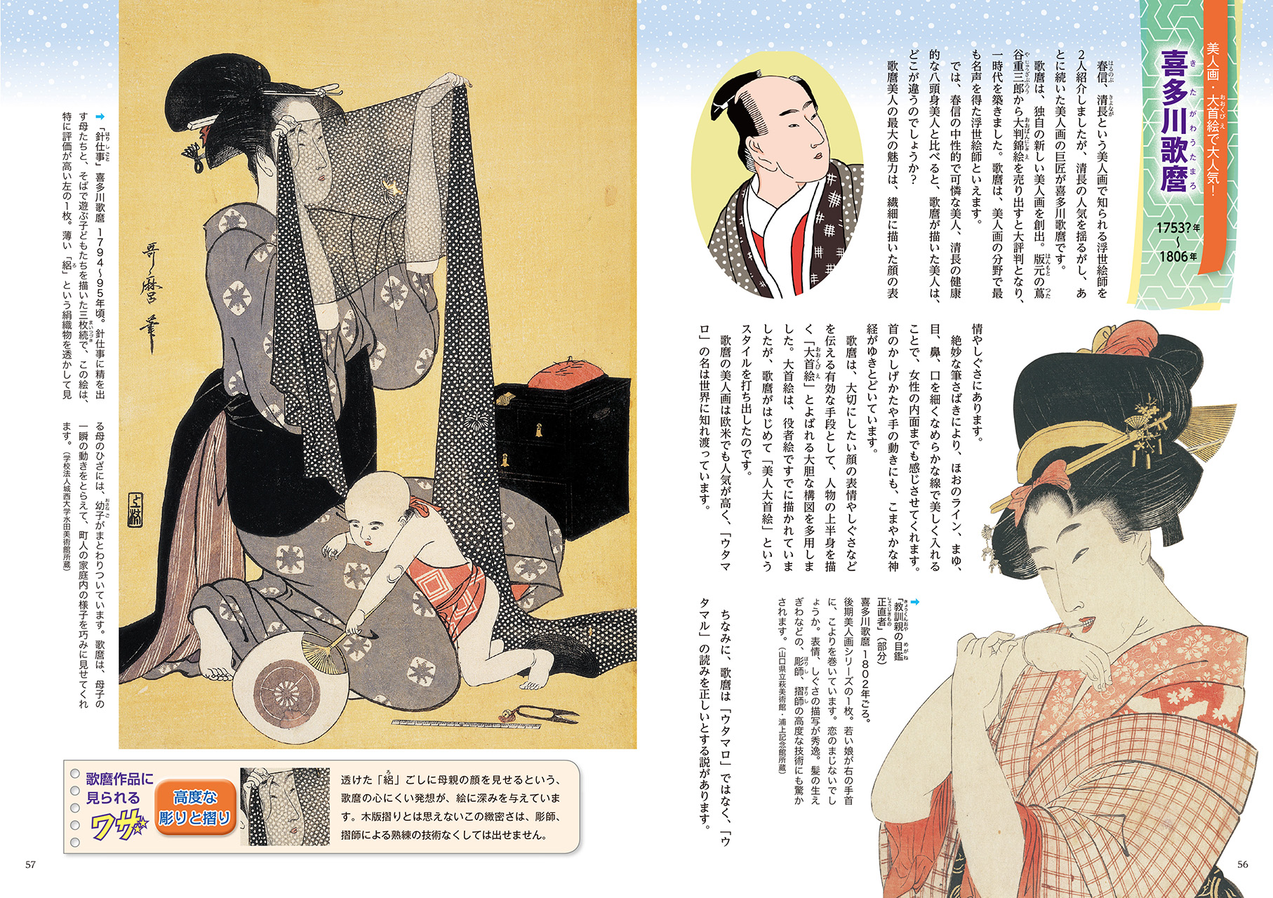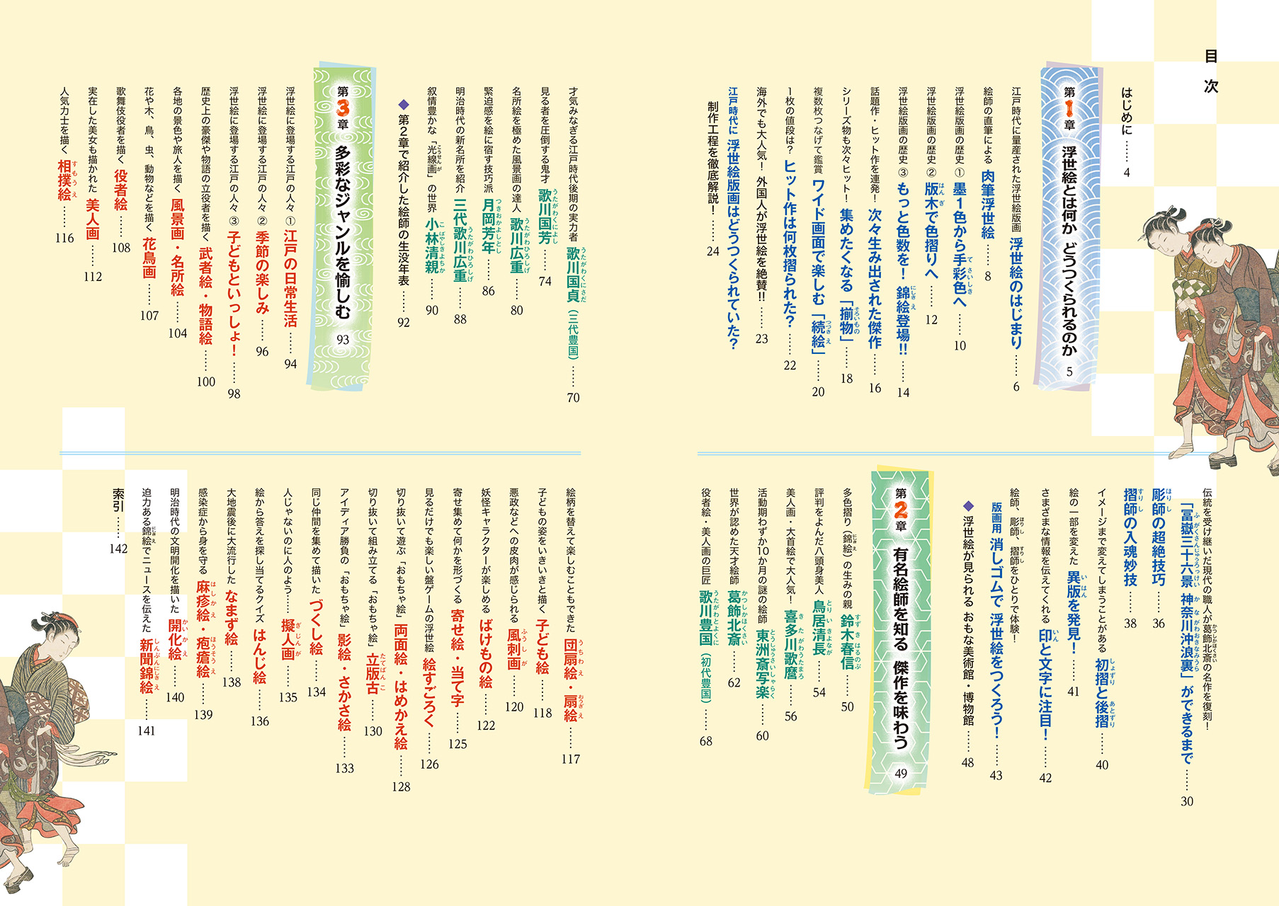 ていねいで、くわしく、わかりやすい。基礎知識と制作工程から、人気絵師の名作、絵師・彫師・摺師のスゴいワザ、武者絵・名所絵・ばけもの絵・判じ絵まで、浮世絵のすべてがわかる。新装版