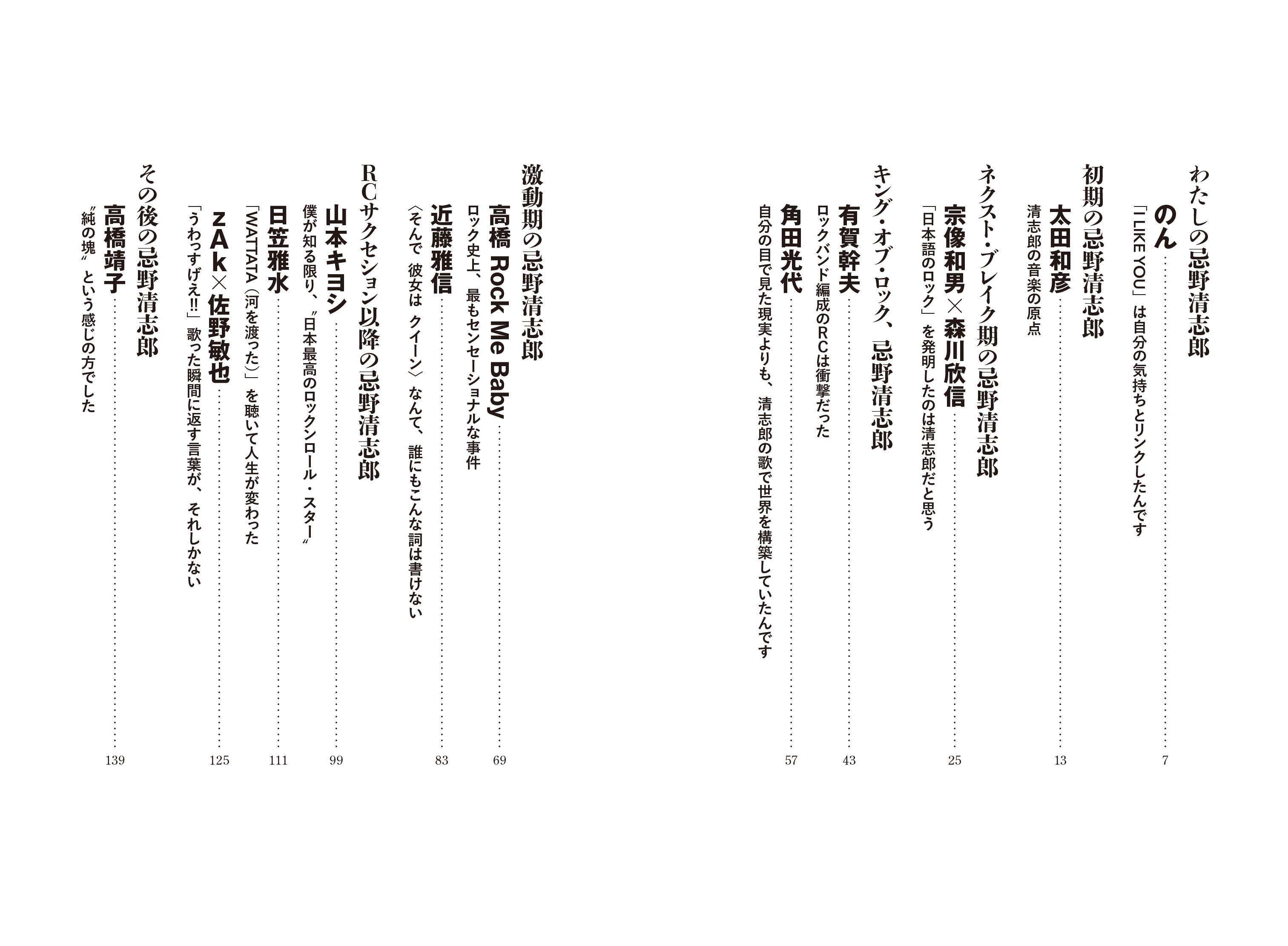 初期のRCサクセションを知る太田和彦から「I LIKE YOU」をカバーしたのん、清志郎亡き後のドラマに出演した渡辺大知、初めて父・忌野清志郎を語る百世。総勢17人の貴重な証言。