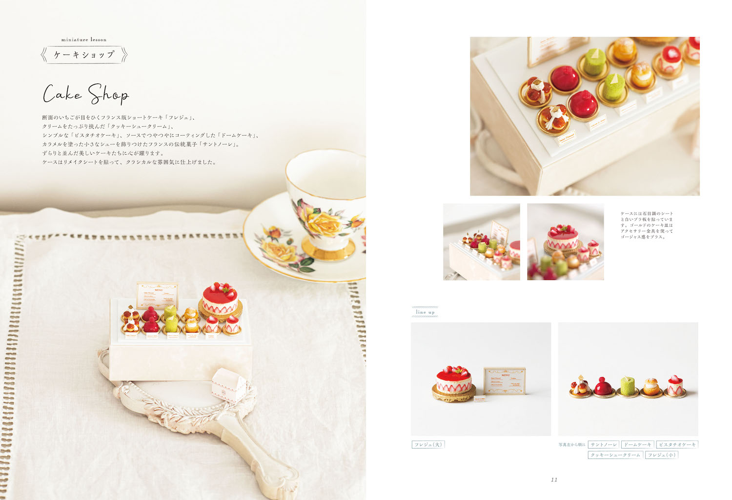 パティスリーにアイス屋さん、クレープ屋さんに和菓子屋さん…小さな小さなお菓子のお店が大集合。スイーツは勿論、ディスプレイのための「お店」作りや、トレーや籠の作り方もご紹介!