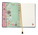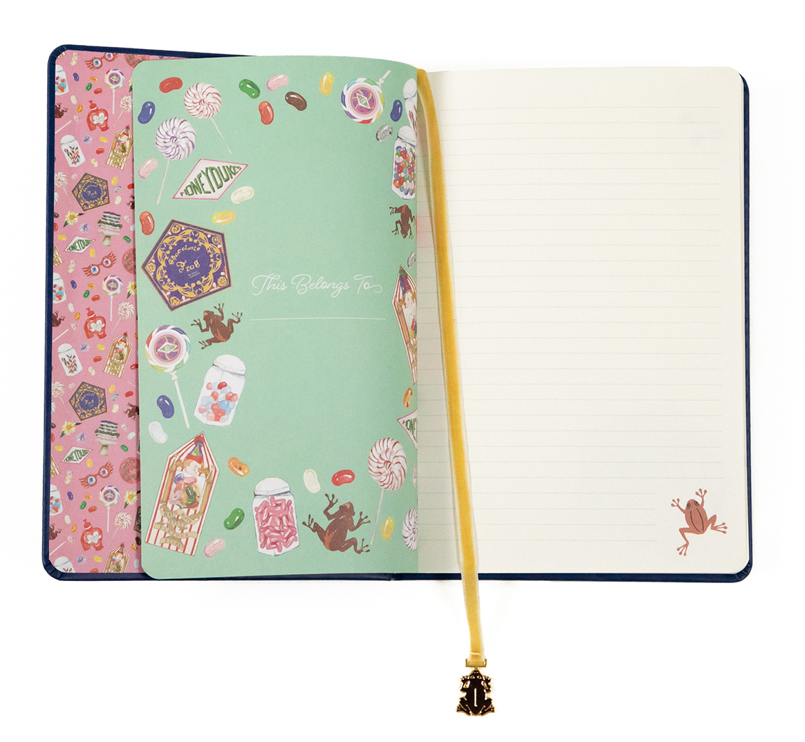 やわらかいフェイクレザーの表紙に箔押しのアクセントが施されたA5サイズのノートです。ベルべットリボンのスピン(しおりひも)に、カエルチョコレートのエナメル加工メタルチャーム付き。ノート部分はオールカラーで、カエルチョコレートやバーティー・ボッツの百味ビーンズなどハニーデュークスのお菓子があしらわれています。罫線入りのページになっており、日記や雑記、レシピノートなどさまざまなメモや記録を記すのにぴったり。「ハリー・ポッター」ファン必携のアイテムです。