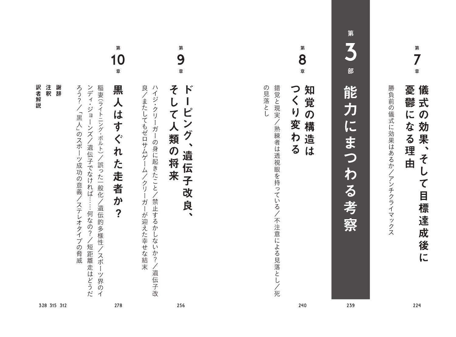 稲妻(ライトニング・ボルト)/誤った一般化/遺伝的多様性/スポーツ界のインディ・ジョーンズ/遺伝子でなければ……何なの?/短距離走はどうだろう?/「黒人」のスポーツ成功の意義/ステレオタイプの脅威