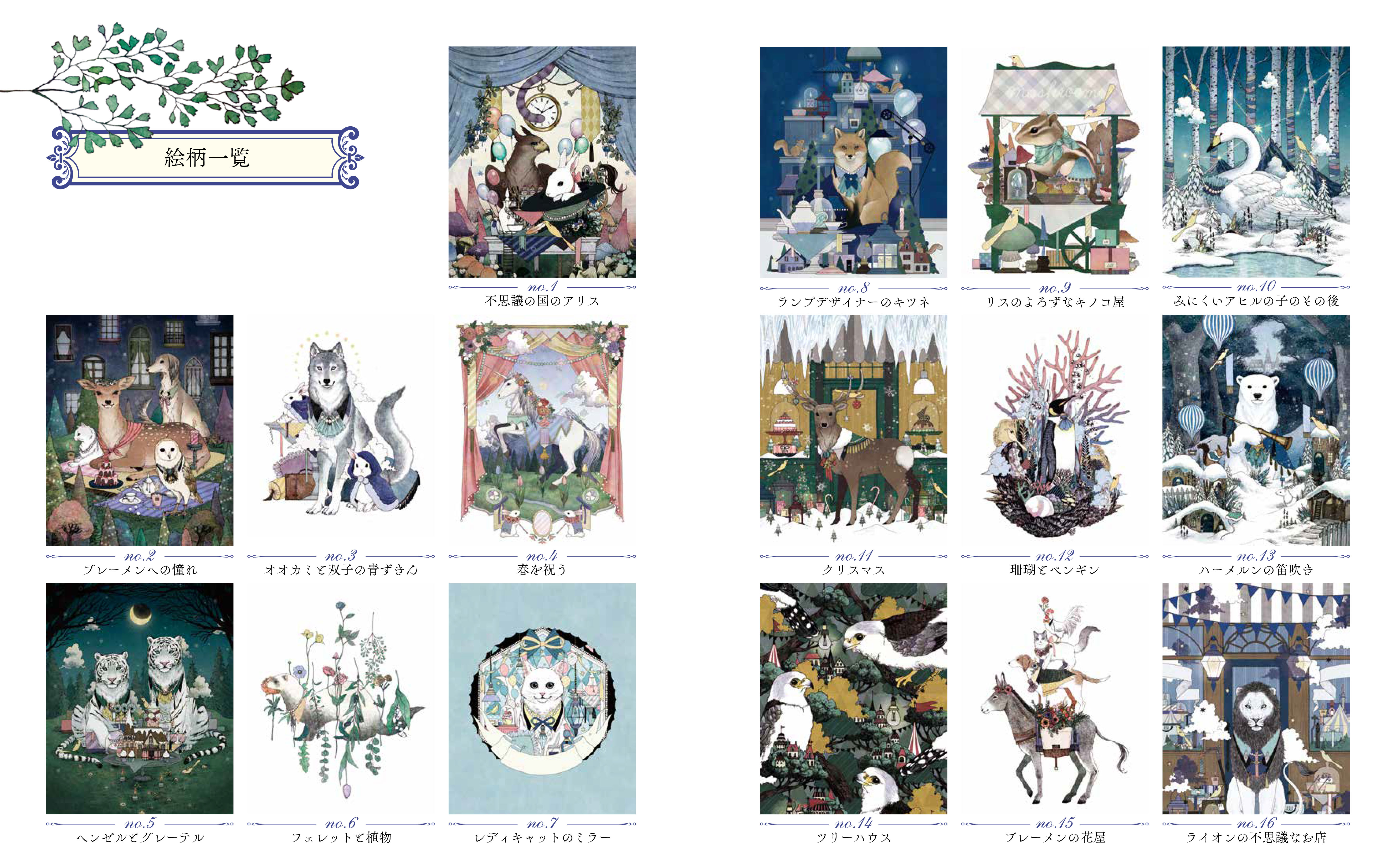 物語の中や、さまざまな場所で出会った動物たちとの思い出をもとに、おとぎ話のような不思議な世界を描いています。大きなサイズで原画と塗り絵を各16枚収録している特別な塗り絵。