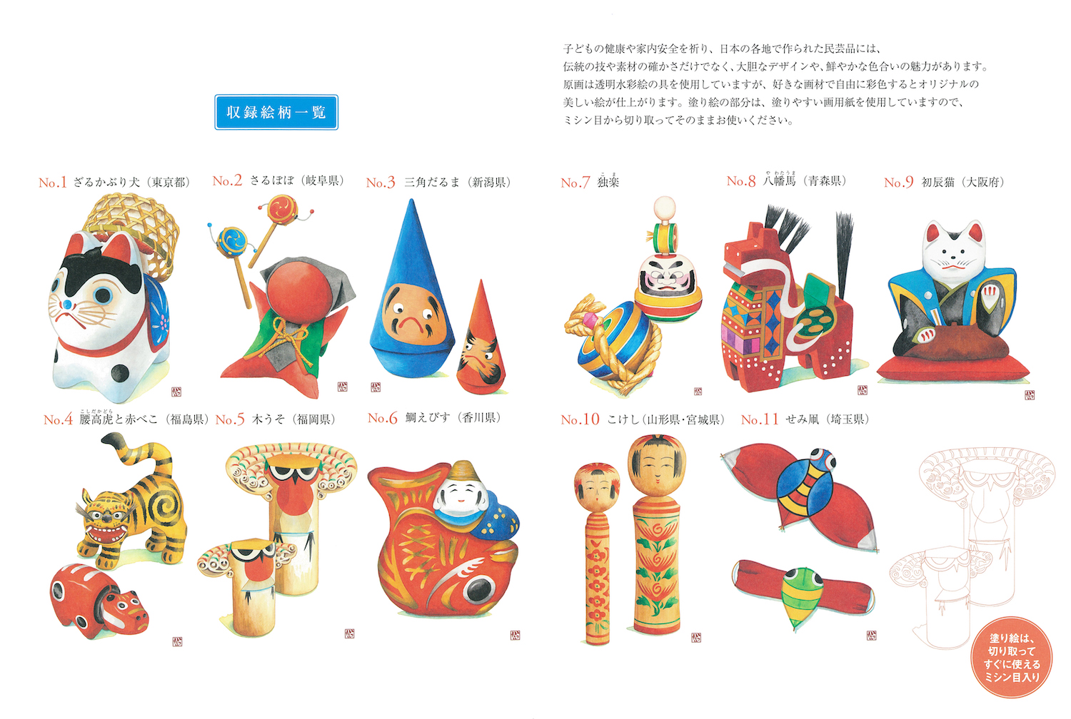 赤べこ(会津)、ざるかぶり犬(東京)から東北のこけし、木うそ(福岡)まで、全国各地に伝わる味わい深い民芸品11点を収録。伝統の技や各地に想いを馳せながら仕上げるのが楽しい1冊。