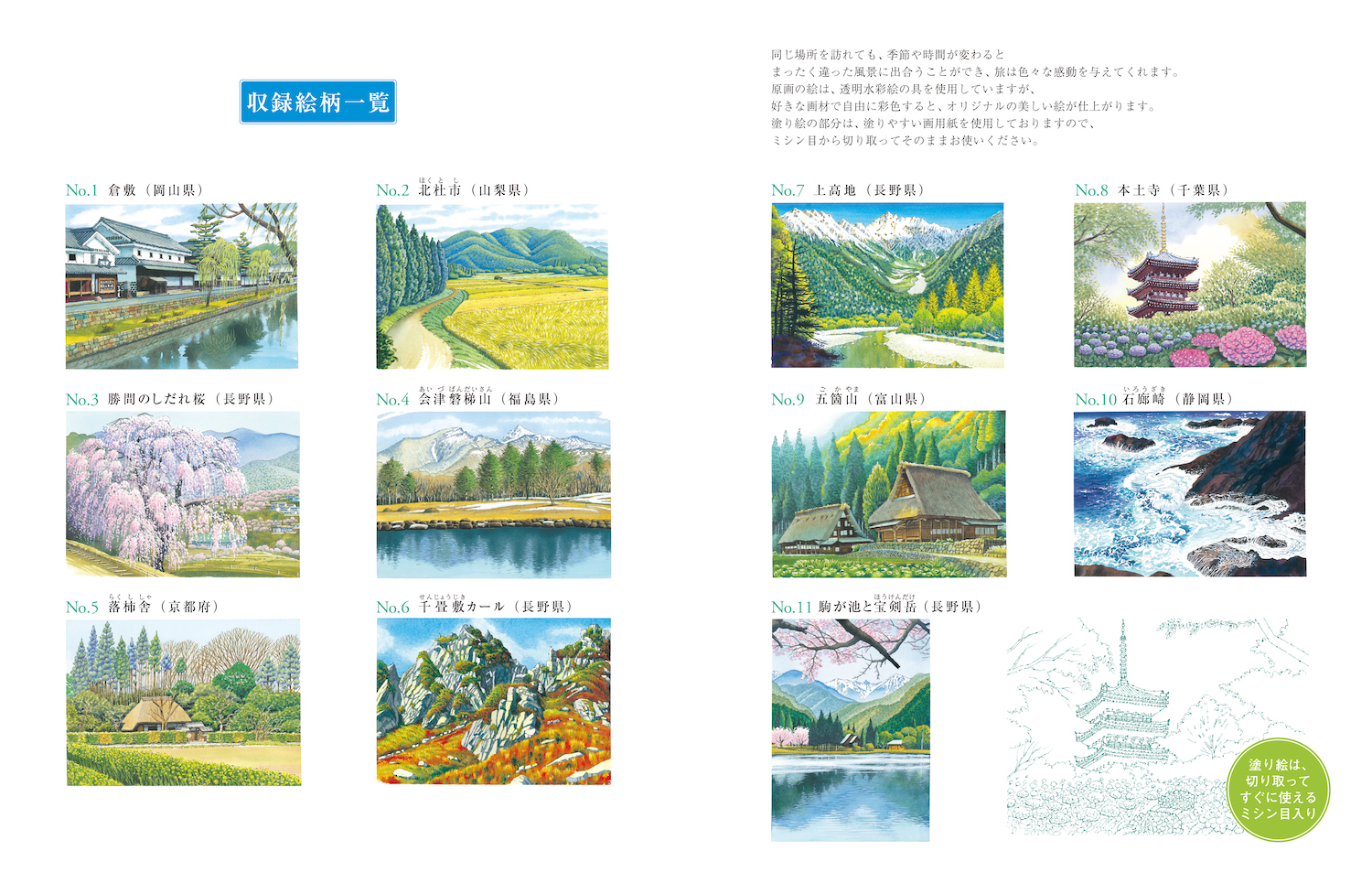 上高地、倉敷、五箇山、京都、伊豆など各地の美しい風景を集めました。四季折々の旅情溢れる原画をお手本に、オリジナルの絵に仕上げてみては。はじめての人にもおすすめの塗り絵です。